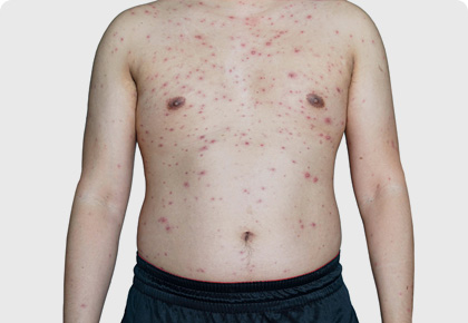 2차적으로 전신에 광범위하게 구진 인설성(잔비듬이 융기된)발진이 돋아나는 질환입니다.